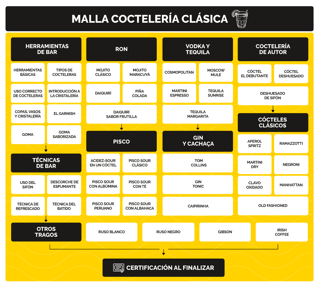 A través de este curso podrás iniciarte en la coctelería profesional, clásica y de vanguardia. Aprendiendo interesantes técnicas y atractivas recetas que luego podrás desarrollar por tu cuenta, aprenderás las recetas más famosas a nivel mundial de cócteles y aperitivos, las que se usan en cualquier bar del mundo, y además todo lo necesario sobre uso de cocteleras y mezclas.