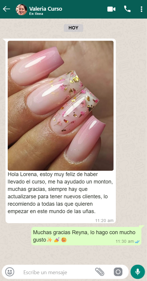 «Este curso me dio la confianza y las habilidades necesarias para iniciar mi propio negocio de uñas. Ahora soy conocida en mi comunidad y tengo un flujo constante de clientes. ¡Transformó mi pasión en una carrera exitosa!»