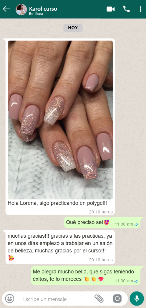 «Tomar el curso de uñas en polygel me permitió combinar mi amor por el arte y la belleza con una nueva fuente de ingresos. He creado una base de clientes fieles y disfruto cada momento de este trabajo.»